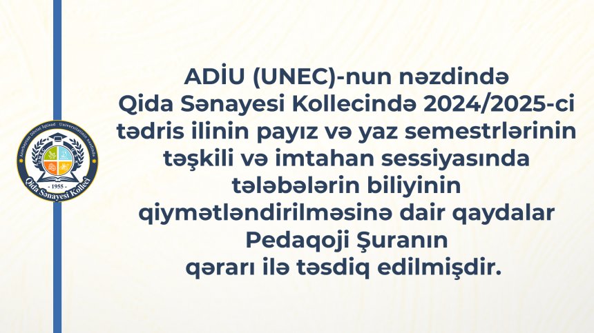 ADİU (UNEC)-nun nəzdində Qida Sənayesi Kollecində 2024/2025-ci tədris ilinin payız və yaz semestrlərinin təşkili və imtahan sessiyasında tələbələrin biliyinin qiymətləndirilməsinə dair qaydalar Pedaqoji Şuranın qərarı ilə təsdiq edilmişdir.